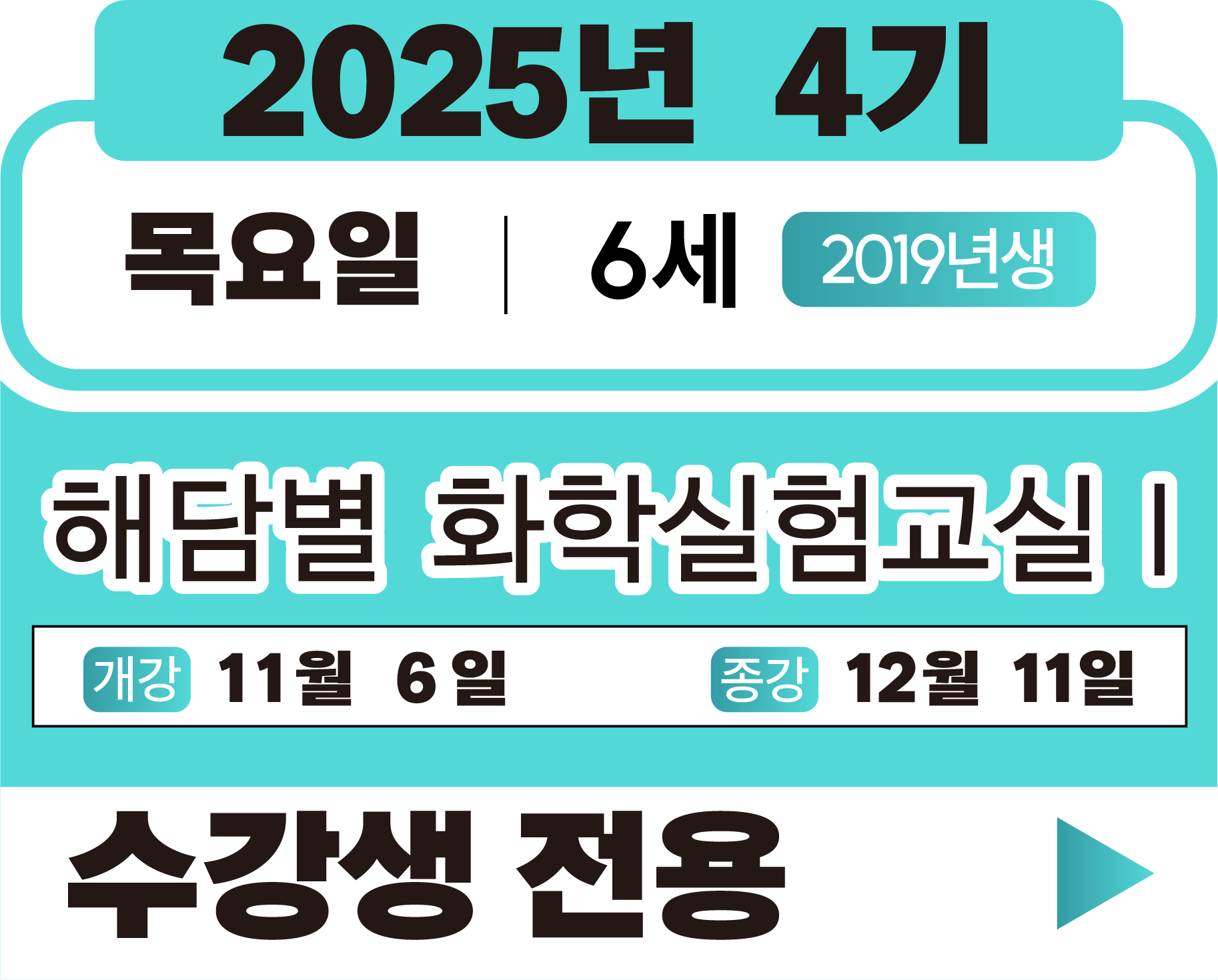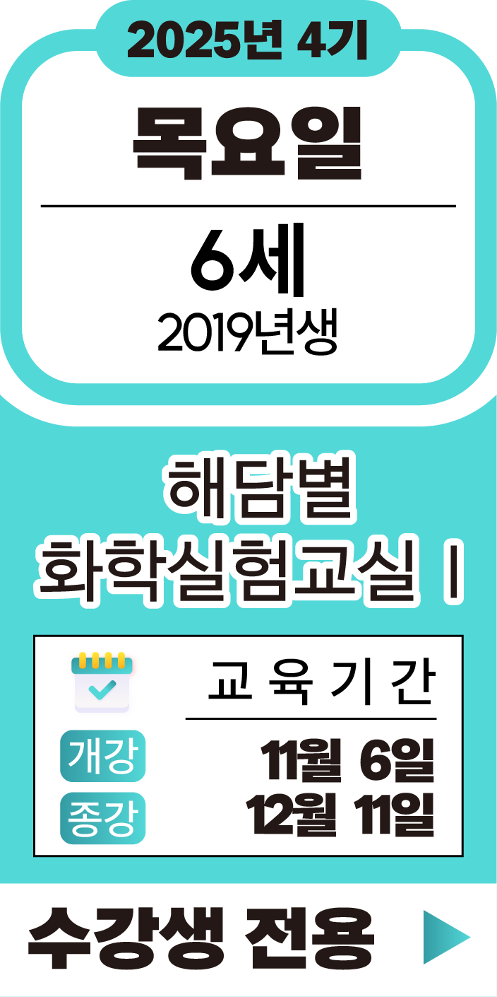 | 6세 (2019년생) | 목요일 16:30-17:20 (50분) | 해담별 바이오생명교실 | 해담별 우주탐험교실 | 해담별 전자공학교실Ⅰ | 해담별 화학실험교실Ⅰ |