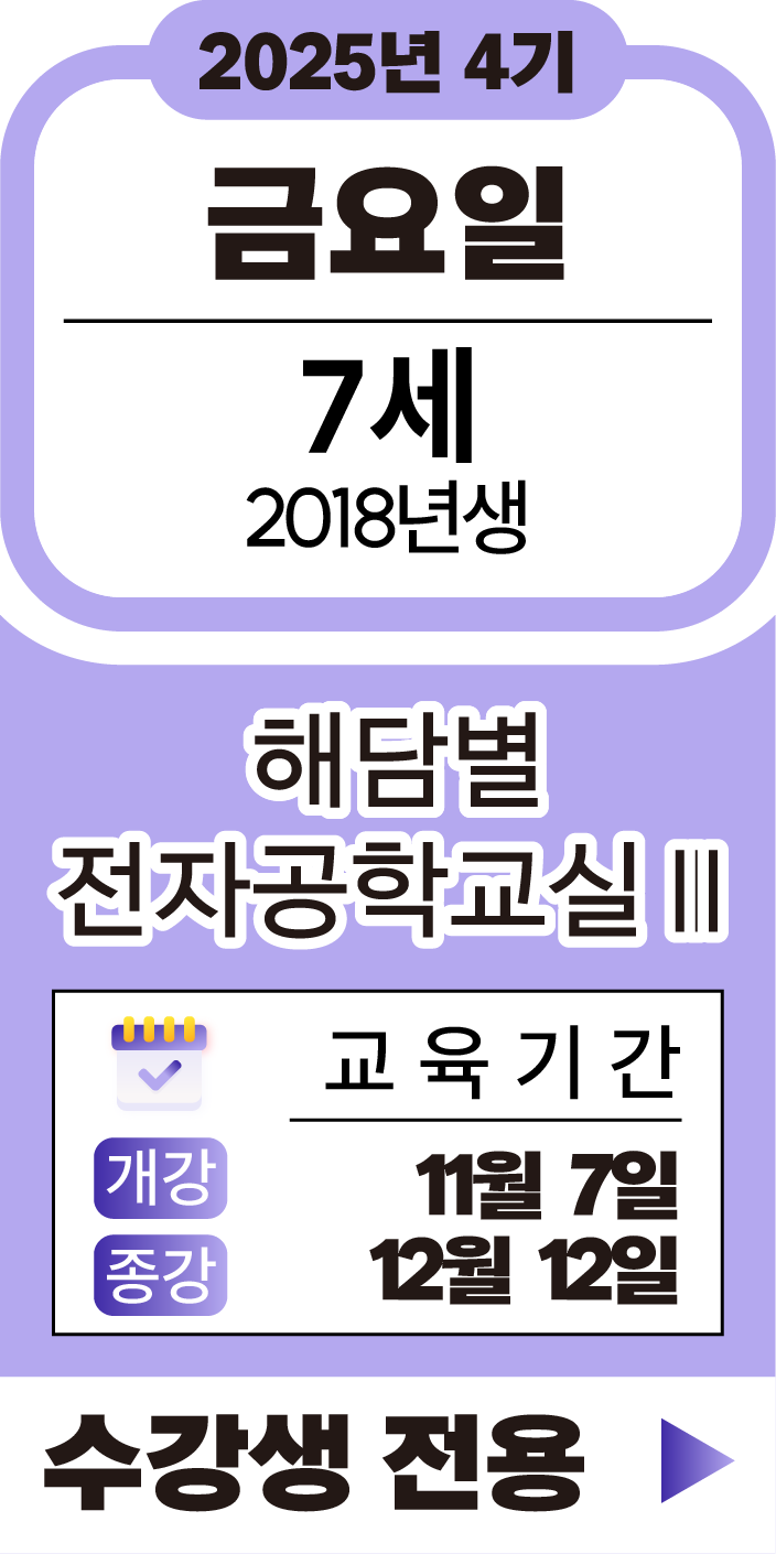 | 7세 (2018년생) 초등학교 1학년 | 금요일 16:30-17:20 (50분) | 해담별 물리실험교실 | 해담별 지구탐험교실 | 해담별 화학실험교실Ⅱ | 해담별 전자공학교실Ⅱ |