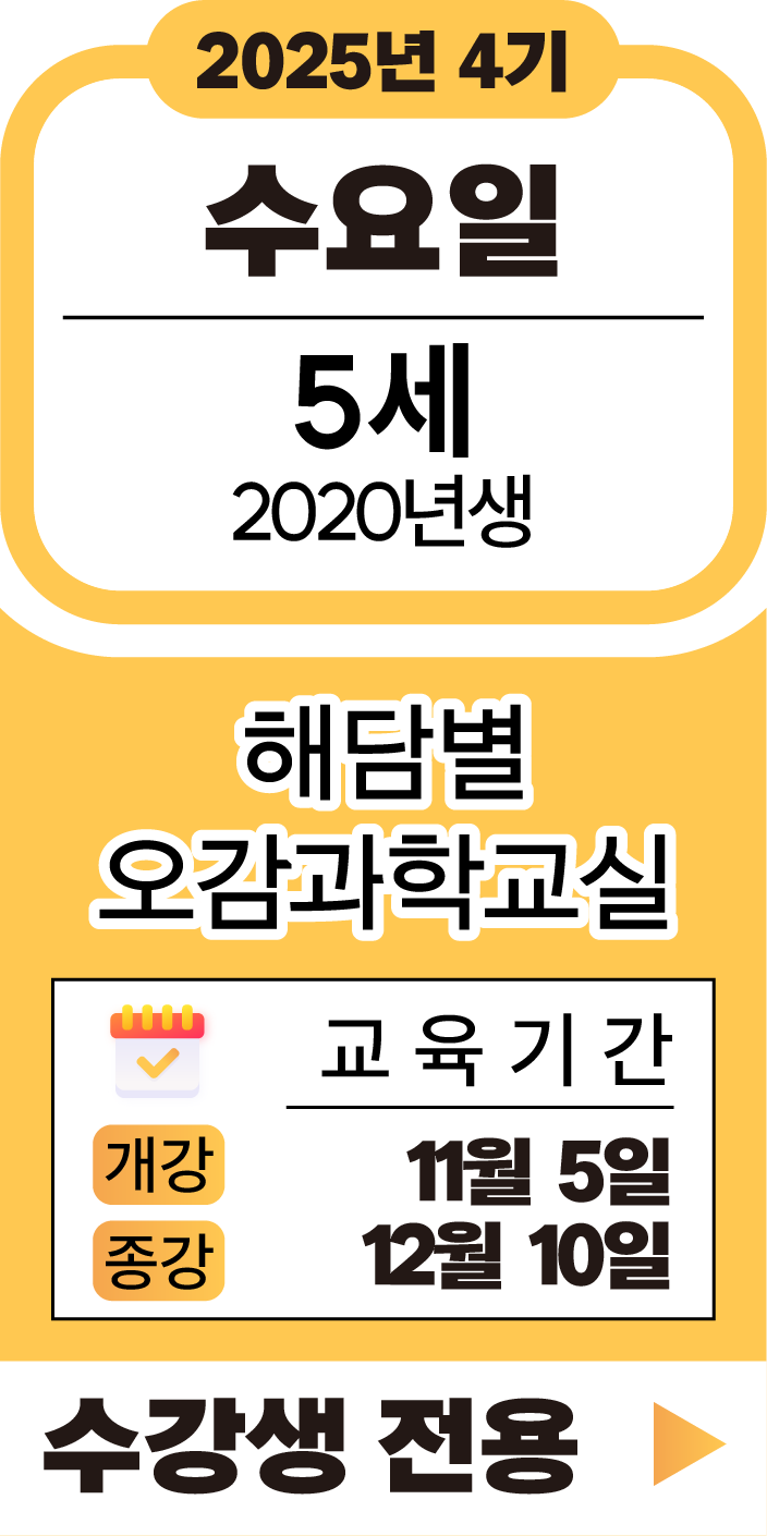 | 5세 (2020년생) | 수요일 16:30-17:20 (50분) | 오감과학교실Ⅰ | 오감과학교실 Ⅱ | 오감과학교실 Ⅲ | 오감과학교실 Ⅳ |